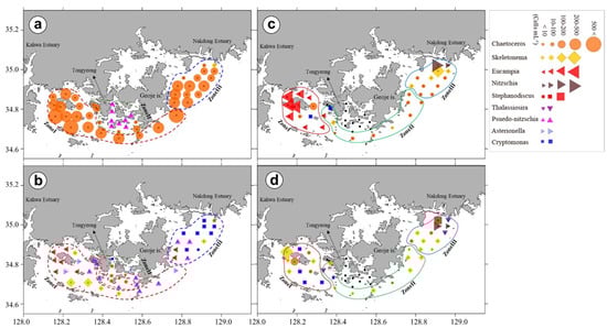 We analyzed the abundances of the dominant phytoplankton genera, which were composed of eight diatoms and one cryptophyte (Figure 8). During October, the diatom Chaetoceros spp. was dominant at Zones I and II, and Pseudo-nitzschia spp. had a high abundance at Zone II. The second most dominant groups were the diatoms Eucampia spp., Skeletonema spp., Pseudo-nitzschia spp., and Asterionella glacialis. During February, E. zodiacus was present at the inshore area of Zone I, and Skeletonema spp. and Chaetoceros spp. had relatively high levels at Zone III. Overall, the freshwater diatom Stephanodiscus spp. had a high abundance at Station 37 (Nakdong Estuaries of Zone III). The abundance of cryptophytes was relatively high at Zone III during October and at Zone I during February.