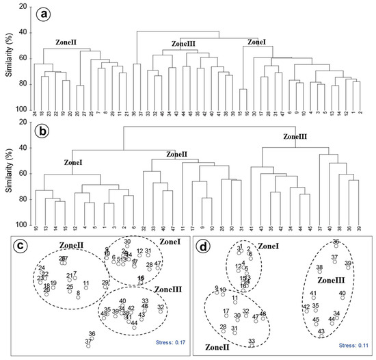 Cluster analysis of phytoplankton assemblages during (a) October and (b) February, and multidimensional scaling (MDS) analysis during (c) October and (d) February (see Figure 1c.).
