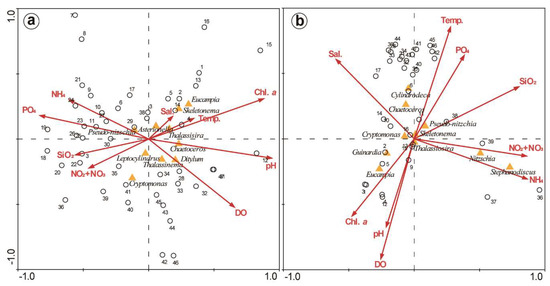 Canonical correspondence analysis of the relationships of the dominant phytoplankton genera and environmental factors (temperature, salinity, Chl-a, DO, pH, and inorganic nutrients (NO2 + NO3, NH4, PO4, and Si)) during (a) October and (b) February.