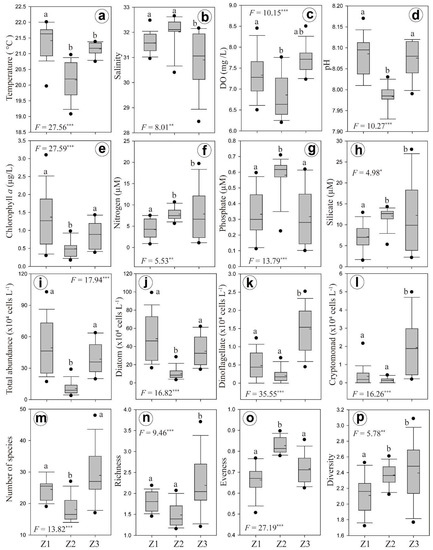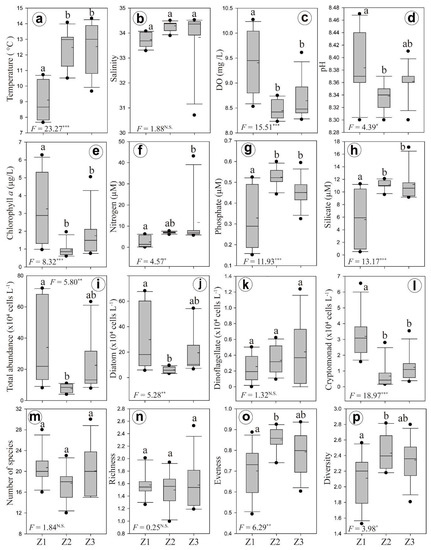 Box plots of environmental and biological factors in the surface waters of the three zones during February. Median: solid line within the box. Results were from one-way ANOVA. “a” and “b” indicate significant differences, N.S.—not significant, *** p < 0.05, ** p < 0.01, and * p < 0.005.