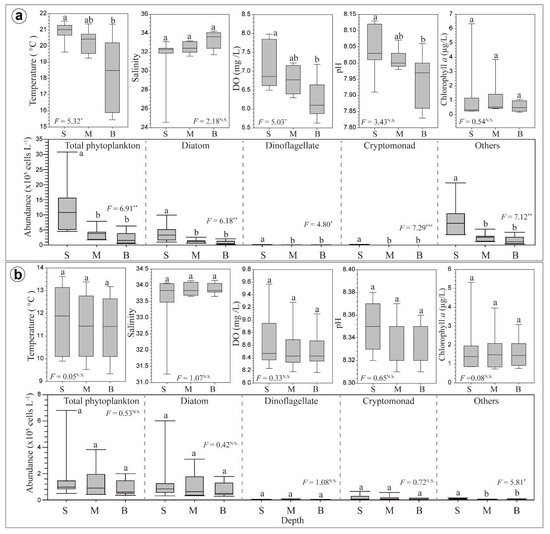 Box plots of abiotic and biotic factors at the surface, middle, and bottom layers of the red station during (a) October and (b) February. Median: solid line within the box. Results were analyzed using one-way ANOVA, “a” and “b” indicate significant differences, N.S.—not significant, *** p < 0.05, ** p < 0.01, and * p < 0.005.