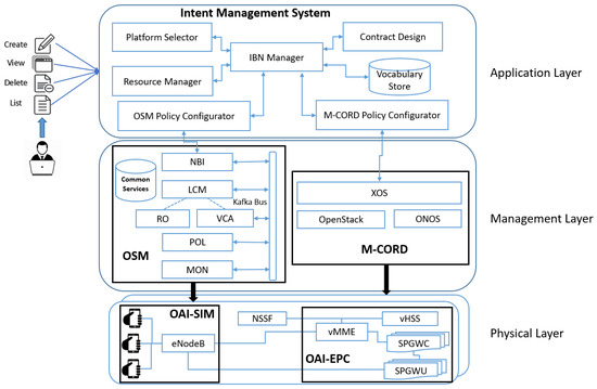 The functioning of all three layers is as follows: Operators provide high-level intents using the web interface of the Intent Management System, and then these intents are converted into the configurations of a selected orchestrator. Afterward, the M-CORD and OSM platform receive the configuration details through the application layer and then implement these received configurations on the physical layer. Thanks to the open source project OAI, EPC and veNodeB for the mobile network are implemented on the physical layer using the provided VNFs.
