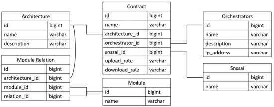 The Vocabulary Store is the database that stores all of the input taken from the GUI as well as the architectures that the registered orchestrators support in each domain. This database is designed by keeping in mind the dependency of each VNF in such a way that the generation of service graphs becomes very easy. Figure 4 shows the design of the database. The Module Relation table helps the Intent Manager to generate the service graph for the topology to be orchestrated. The S-NSSAI table holds four basic slice configurations that allow the user to create different QoS-based (upload rate/download rate) slices, while the orchestrator option lets the user select the orchestrator that will be responsible for orchestrating and managing the VNFs within the network service generated via the contract of a user. Currently, the proposed system supports two orchestrators, i.e., OSM and M-CORD. The proposed system also supports the orchestration of the open-source LTE Advanced VNFs provided by EureCom. Overall, the Vocabulary Store helps the Intent Manager to automate the process of orchestration and management.
