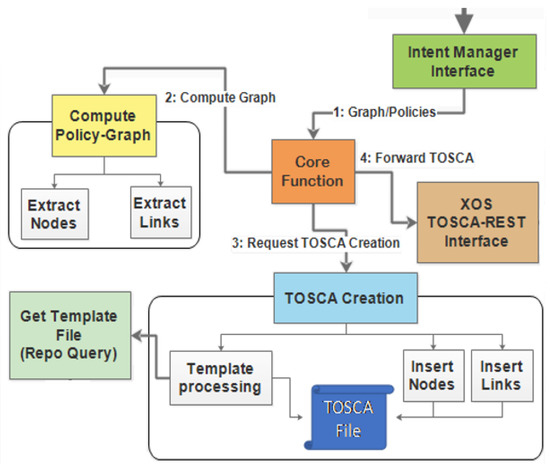 Initially, the Core Function module sends a request to the Compute module to extract the nodes and links from the received policy graph. Afterward, the TOSCA Creation module fetches the file from the Central Data Repository and inserts the links and nodes into the file to create the TOSCA File.