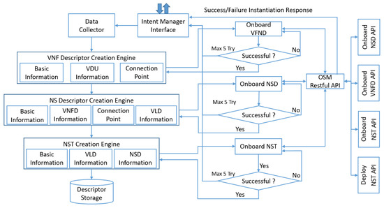All engines depend on each other because the output of one engine is used in the module of the proceeding engine. All engines create JSON descriptors and forward them to the onboarding module to store all descriptors in the OSM repository. Each onboarding module uses the OSM Restful API interface to send a request to the OSM, and tries a maximum of five times in case of failure. If a request fails more than five times, the OSM API interface sends a fail notification to the Internet Manager Interface, and then the rest of the procedures stop automatically. Onboarding of each module is a pre-requisite for NST instantiation because OSM uses this descriptor to instantiate the network service. At the end of the onboarding of all descriptors, this Policy Configurator sends the instantiating request to the OSM for the deployment of the required service on NFVI.
