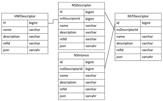 After the creation of all descriptors, this Policy Configurator module stores the information and relation of each module in the local database. This Policy Configurator keeps this information to delete the relevant descriptor and instances if it is required. As mentioned above, each descriptor depends on another descriptor; therefore, each table contains the foreign key of a dependent table. All tables contain the generic field name, description, and JSON to hold the general information of the descriptor. However, the ID fields of each table hold the auto-generated unique serial number of a new entry in the table, and the refID fields of each table hold the responded onboarding reference ID of the OSM orchestrator. The relational database design for descriptors and instances can be seen in Figure 8.