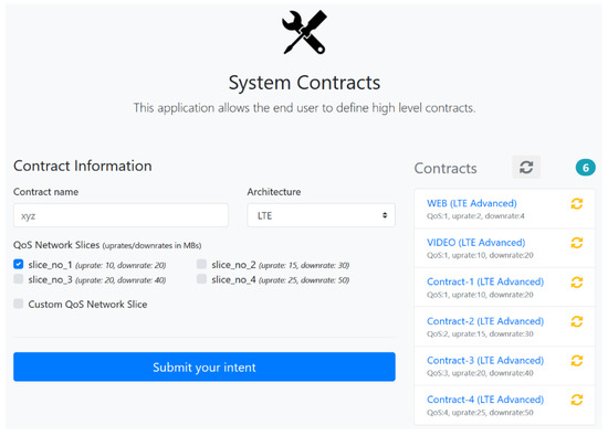 In the Intent Management System, the contract represents the user’s intent. This intent consists of Single Network Slice Assistance Information (S-NSSAI), network architecture design (LTE, LTE-A, 5G, etc.), and Quality of Service (QoS) in the form of upload rate and download rate. The network architecture design is required to generate the respective policy graph because every network architecture depends on its suitable policy graph. The 3GPP body has specified the eight different slices for a massive heterogeneous network, which is denoted by the S-NSSAI parameter. In this contract, S-NSSAI represents the type of service; e.g., eMBB, URLLCs, mMTCs, etc. QoS parameters are used to assign the bandwidth to each slice. The Intent Management System provides all of this information in the GUI for the user to create contracts easily. This information is enough for Intent Management System to create the appropriate configuration for the selected network architecture. This contract design module takes these inputs from the GUI and converts simple high-level information into the required form of contract for the Policy Configurator module. Then, information of the contract is forwarded to the central Vocabulary Store.