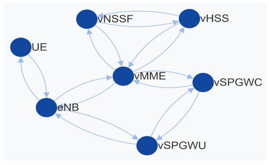 Figure 9 shows all contracts created for both orchestrators using the GUI of the Intent Management System. Each contract also contains the slice configured with predefined QoS values. Two contracts, WEB and VIDEO, were created for OSM and the other four contracts for M-CORD. The predefined QoS values of Slice-1 to Slice-4 are listed in Table 2. Employing the results of the created contract, the Intent Management System also generates a graph for the selected architecture, which is shown in Figure 10. The generated graph represents the advanced LTE network architecture, which contains the vNSSF, vMME, vHSS, vSPGW-C, vSPGW-U, and an eNB. This generated graph is used for deployment on the physical layer. The Intent Management System generates the configurations for this graph according to the selected platform automatically by using the corresponding Policy Configurator. This is the essence of the Intent Management System, because the user should not need to worry about the technical details for implementing the required service. At the management layer, the orchestrator receives the network configurations and deploys on the physical layer.