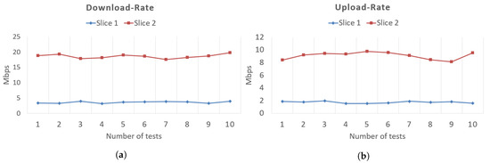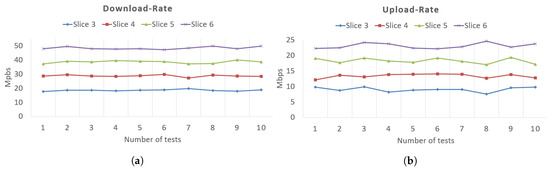 The performed test results of upload rate and download rate values for Slice 3 to Slice 6 are shown in Figure 12. The upload rate and download rate QoS values for Slice 1 and Slice 2 are shown in Figure 13. The data which have been depicted in these figures are a collection of the data that we regarded as authentic for the connection of UE with the data network. At the premises, a 100 Mb/s internet connection was available; therefore, it was not possible to generate traffic on all slices in parallel. To evaluate the benefit of network slicing, different combinations of slices were selected to generate traffic. The selected combination of slices should not exceed the maximum available bandwidth of the provided network architecture; e.g., Slice 1 and Slice 2, Slice 3 and Slice 4, or Slice 5 and Slice 6.