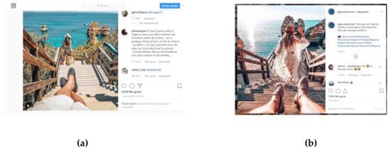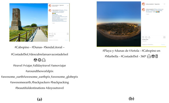 The hashtag strategies of the two Instagram accounts were completely different. While Algarve used a small and repeated number of hashtags, Costa del Sol preferred to include a large number of hashtags in their posts. Their own hashtag or ones linked with the destination predominated in the Algarve Instagram; by contrast, @VisitaCostadelSol drew on popular social media and tourism hashtags not always related to the photo, such as #backpackers and #backpacking, or very general hashtags such as #travelgrams, #allshots, or #beautifuldestinations. The post was sometimes full of hashtags and there was no description apart from that. Two examples are presented below (Figure 1).