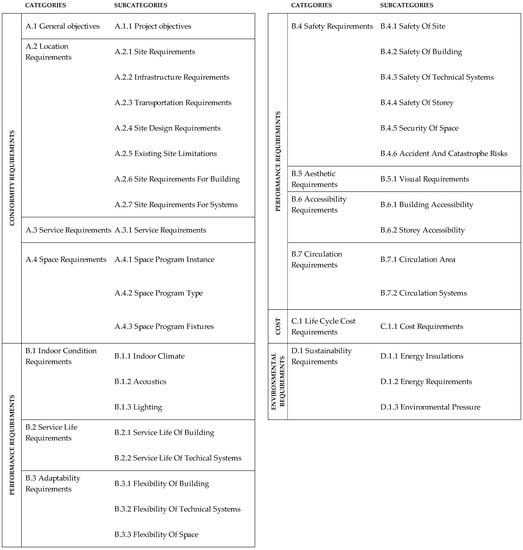 | Structure | Definition of categories, organized in hierarchical levels, which group different types of requirements, such as space, components, and type of performance | [48,49,51,52] | [13,37,39,41] |
