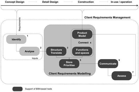 - Requirement information must be stored (step 6) in BIM-based tools, which can provide support to collaborative work and make requirements available to the main stakeholders. Storage allows requirement information to be reused. For instance, templates of requirements can be created and stored for similar products (e.g., projects from the same housing programs). Such a template could also be used by professionals involved in the assessment of project proposals for the same housing programs. Based on an explicit model of client requirements, some priorities can be established, in case trade-offs are necessary.