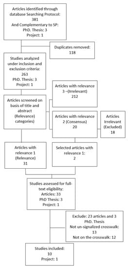 By applying the search protocol, 381 articles were identified, complemented by 3 doctoral theses and 1 project as recommended by the consulted experts. A total of 118 items were removed because they were duplicates. For the remaining 263 unique articles, 3 PhD theses, and one project, the inclusion and exclusion criteria (specified in Section 2.2), the titles, and the summaries of each study were applied. This analysis was separated into three categories to make a more detailed selection without omitting possible relevant studies. The categories were divided into relevant (1), consensus (2), and irrelevant (3). It was determined that 31 studies were relevant. In addition, 20 studies had to be evaluated, and a consensus of reviewers concluded that 2 of the 20 studies had a relevance for the systematic review. Finally, it was determined that 212 studies were irrelevant to the objectives of this work. The selection of titles and abstracts identified 33 articles, 3 PhD theses, and a project for the revision of full text. Based on this review, 23 articles and 2 theses were excluded for the following reasons: 12 studies analyzed the pedestrian-vehicle interaction in pedestrian crossings controlled by traffic lights, 11 studies analyzed pedestrian-vehicle interaction outside the pedestrian crossing. Moreover, the 3 doctoral theses were excluded because scientific articles were published based on those theses that had already been rejected or taken into account in previous procedures. Altogether, 11 articles and one project met the inclusion criteria and were evaluated in the present work. The process described above is presented in a summarized manner in the flow diagram recommended by PRISMA in Figure 1.