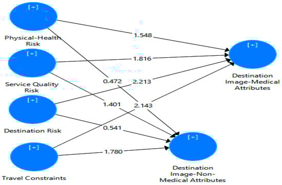 In PLS, the main evaluation criterion for the goodness of the structural model is that the R2 measures the coefficient of determination and the level of significance of the path coefficient [60]. The recommended value [61] of R2 between 0.02 and 0.12 is weak, 0.13 and 0.25 moderate, and 0.26 and above substantial. However, Hair, Ringle [60] qualified these figures and suggested that a high R2 is dependent on specific research context. The R2 of destination image-medical attributes is 0.102 and non-medical attributes 0.083 which shows the percentage of total variance explained of these variables by respective exogenous variables. Figure 2 shows the respective exogenous variables of the two endogenous variables.