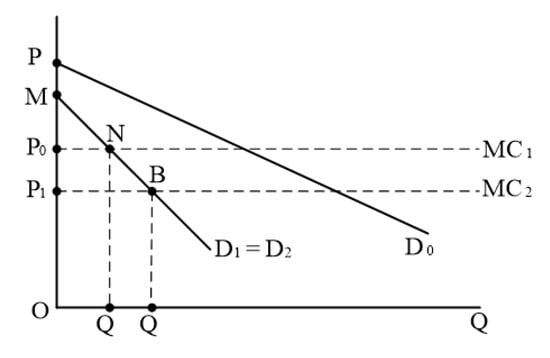 When forest farmers cooperate to supply forestry infrastructure, the costs borne by individual forest farmers must be reduced, regardless of whether forest farmers have the same demand for forestry infrastructure. At this point, for a single forest farmer, consumer surplus will increase. The supply of forestry infrastructure increases for the entire forest area, achieving Pareto optimality. Assuming that forest farmers have the same demand for forestry infrastructure, a supply–demand model can be used to study the feasibility of a cooperative supply of goods for forestry infrastructure [57]. The specific analysis is shown in Figure 1.