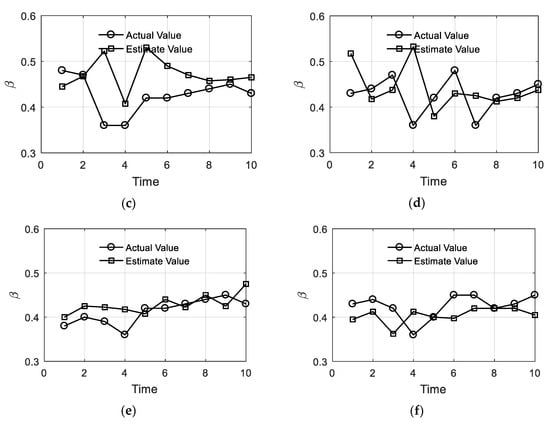 The average estimated and actual value of the rate of return β in each period: (a) under the conditions of Experiment 2 (NC), when the group members could not communicate (statistics on the estimated and true value of the rate of return β); (b) under the conditions of Experiment 2 (C), when the group members could communicate (statistics on the estimated and true value of the rate of return β); (c) under the conditions of Experiment 5 (NC), when the group members could not communicate (statistics on the estimated and true value of the rate of return β); (d) under the conditions of Experiment 5 (C), when the group members could communicate (statistics on the estimated and true value of the rate of return β); (e) under the conditions of Experiment 6 (NC), when the group members could not communicate (statistics on the estimated and true value of the rate of return β); (f) under the conditions of Experiment 6 (C), when the group members could communicate (statistics on the estimated and true value of the rate of return β). “Actual value” and “estimated value” represent the number of experimental coins under different experimental conditions. Before each round of experiments began, each member had 50 initial coins. “Time” is the number of rounds in the experiment, and 1–10 represents rounds 1–10. Each experiment contains 10 rounds.