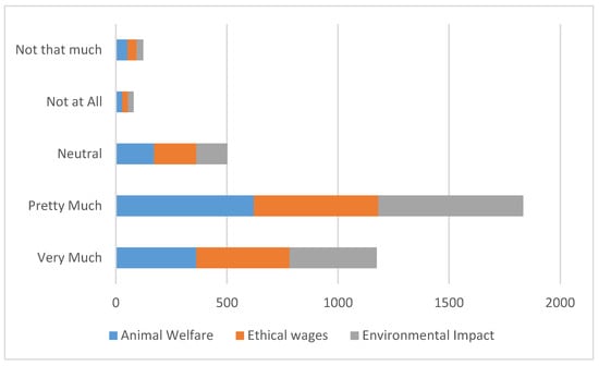 Considering the focus of the paper, the following analysis will be based on the questions related to sustainable fashion (H1, H2, H3) and the circular economy (DRQ1). According to the fact that the number of people buying ethical clothes is increasing, but still represents a niche market [95], respondents were asked to think about shopping ethically and give, according to their personal values, more or less importance to various aspects of sustainability practices; as we can see in the next graph (Figure 2), basically, those aspects were equally important for the respondents.
