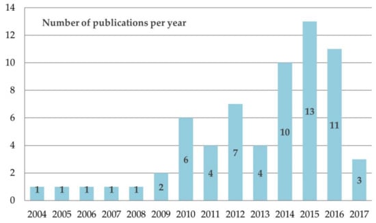 The number of published CVMA studies increased gradually from 2009, with an upsurge in publishing in 2014–2016 (Figure 1). This continual increase may indicate either scholarly response to a higher demand for this type of information or the growing interest of the research community in using vulnerability assessments to study hazard-related complexities in coastal systems. It may also suggest that this trend reflects more confidence among researchers in exploring the nexus of physical and social circumstances in the coastal zone, using vulnerability mapping in parallel with the advancement and visibility of the vulnerability field in other disciplines. Lastly, it may be possible that, once a new methodology is published, it will lead to its reproduction in other contexts and different geographic areas. As a part of the evaluation, we also assessed the papers’ disciplinary grounding and found that about half of the papers (i.e., n = 32) fell under the natural hazards and disaster field, about one-third (n = 19) were focused on climate change, and the rest (n = 14) discussed both aspects but did not always include both of them in the estimation of vulnerability. This demonstrates the continued interplay between a variety of disciplinary backgrounds in the conceptualization of coastal vulnerability.