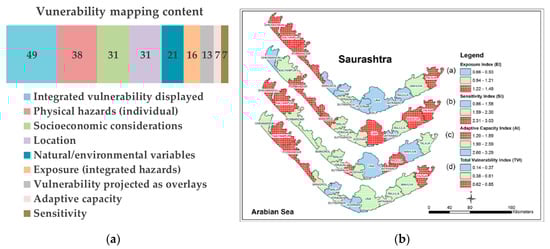 One of three key criteria for inclusion in this analysis was the presence of at least one map of vulnerability (and/or risk), either integrated or presented as an overlay. Beyond this criterion, we also explored whether the studies displayed maps of individual vulnerability indicators such as physical hazards, socioeconomic considerations, environmental variables, and aggregated components such as exposure, adaptive capacity, or sensitivity (Figure 3a). Results show that very few studies (n = 6) provided only a map of integrated vulnerability, e.g., [,], while the majority of papers also displayed the physical hazard (n = 38), socioeconomic aspects (n = 31), and/or environmental variables (n = 21). Only a few studies provided maps of aggregated components of vulnerability (e.g., Mahapatra et al. []) (Figure 3b), even though such intermediate maps may be very helpful to better understand the overall vulnerability. This seems odd given that over half of the papers indicated such subcomponents were estimated and then aggregated into a measure of vulnerability. It is possible that a lack of such figures is owing to the space limitations imposed by many journals or the various subcomponents having a similar spatial distribution to the final vulnerability metric.