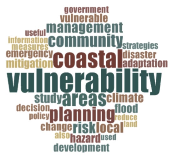 To evaluate the policy relevance content that followed the coastal vulnerability mapping product, we extracted the policy-relevant text from the examined studies and analyzed it using qualitative analysis software. Unsurprisingly, considering the context of evaluated studies, vulnerability and coastal were the two most frequently occurring words in the policy relevance text (Figure 5). The same applies to the words planning and management, which were also among the most frequently occurring words, indicating that many authors recognize the role of vulnerability assessment maps in helping policy-makers to plan for and manage these risks. Two other frequently occurring words were community and local, suggesting that the community/local scale represents a leading focus of CVMAs, something that is well supported by the relevant literature []. Another word that frequently occurred in reviewed studies is climate, indicating that CVMAs recognize the importance of climatic stressors of physical and social vulnerability in coastal settings. The words decision and government were also in the 20 most frequently occurring words, potentially reflecting the notion that the government should be the key actor pursuing policy change to information presented in CVMAs. This science integration is more likely to occur at the local level, considering that local decision-making is generally more responsive to addressing immediate issues in their jurisdictions and available policy mechanisms to respond to challenges in a relatively timely manner (e.g., building and zoning codes, taxes and fees, and public works).