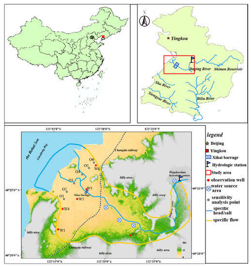 The Daqing River, which originated from the eastern mountain of Yingkou City, is the main surface water in the study area. The width of the riverbed is about 20–300 m. The basin area is about 1468 km2. In order to observe the water level, flow and velocity of Daqing River, the Wangbaoshan hydrological station was built in the middle-lower reaches of Daqing River in 1959. According to Wangbaoshan observation data, the average maximal and minimal values of the river flow are 57 and 0.316 m3/s, respectively. The flow significantly changes with the seasons. In order to adjust the flow variation with the seasons of Daqing River, the Shimen reservoir was built in the upstream of Daqing River. The flow rate is detected to be about 0.9 m3/s at Wangbaoshan hydrological station. In addition, a barrage was built in the lower reaches of Daqing River. It has the functions of storing water, irrigation and blocking tide (Figure 1). In the upper reaches of Daqing River, the riverbank terrace is narrow and the area is small. The valley plain in the lower reaches of Wangbaoshan gradually opens. The observation data of water level in the hydrological station are complete. Therefore, the reach of the Wangbaoshan hydrological station is considered to be a constant head boundary that can reflect the influence of the upstream river on the downstream area.