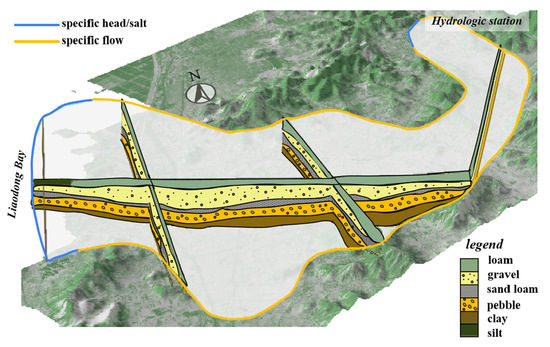 Yingkou City is located in the south wing of Yingkou to the Kuandian uplift, an anticline of Liaodong platform, which belongs to the northern China platform [59]. The mountains were formed by the Yanshan movement, and are distributed in the area from east to west. The terrain gradually changes from high to low from east to west. Geomorphology regularly changes under the influence of structure, lithology and geotectonic movement from east to west, namely, low mountains, high hills, low hills and coastal plains [59]. The study area is a mountain valley plain formed by the alluviation and diluviation of the Daqing River, which originates in the eastern mountain of Yingkou. The Liaoning hydrogeology brigade carried out a geological survey of the middle-lower valley plain of Daqing River in 1973. According to the survey, the conceptual model of the aquifer medium in the study area was generalized (Figure 2), and the characteristics of the aquifer in the study area were analyzed.