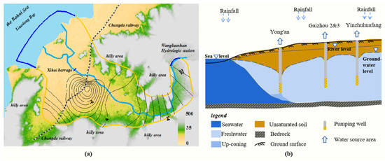 Many large cities in the world are located in the coastal areas and river estuaries. Due to the utilization of groundwater resources for the economic development demands in coastal areas, and sea level rising caused by global warming, the research on the seawater intrusion in estuaries and coastal cities is a hot issue [1,2,3,4,5,6,7]. Seawater intrusion is an important environmental problem that leads to groundwater salinization, freshwater resources reduction, soil salinization and industrial machinery corrosion, endangers human health and seriously restrict the economic development of coastal cities [8,9,10,11,12]. The World Health Organization (WHO) indicated that freshwater is directly nonpotable when it is mixed with about 1% volume of seawater (250 mg/L chloride) [13]. There are two kinds of inducement factors for seawater intrusion, including natural factors (sea level rising, drought and tide) and human factors (groundwater pumping and mariculture) [14,15,16,17,18,19,20,21,22,23]. Compared with the minor equilibrium damage caused by sea level rise, seawater intrusion caused by a large imbalance of hydraulic gradient due to over-pumping groundwater is more important [1,18,24,25,26,27].