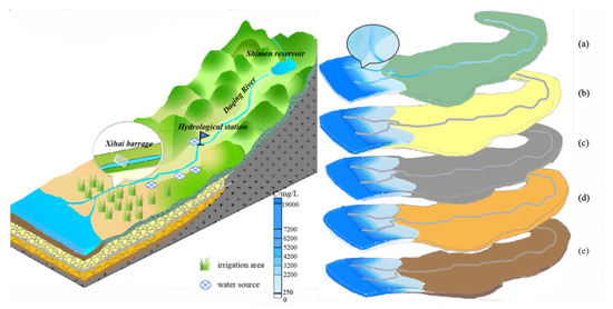 (1) The seawater intrusion was influenced by tide and regulation of barrage. Figure 7a shows that the saltwater intrusion is mainly controlled by the tide and barrage in the first layer. In the Daqing River channel near the estuary, the high tide level seawater moves upward along the channel, and there is a high concentration of seawater intrusion front in the channel. In the vicinity of the barrage, there is an intrusion line inclined to the sea in a small range, which is controlled by the high water level of the barrage.