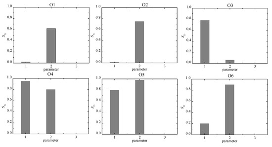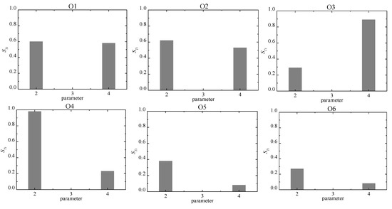 Sobol global sensitivity analysis [48] was carried out in the first, second and fourth layers. In the process of sensitivity analysis, six observation points O1–O6 (Figure 1) were evenly selected in the intruded area, and the chloridion concentration values at different observation points were taken as the model output results. When the Sobol method was used for sensitivity analysis, the seawater intrusion model in the study area was operated for one year. According to the chloridion concentration of six observation points, the full-order sensitivity coefficient STi (Figure 8, Figure 9 and Figure 10) of each parameter at different locations could be calculated [50].