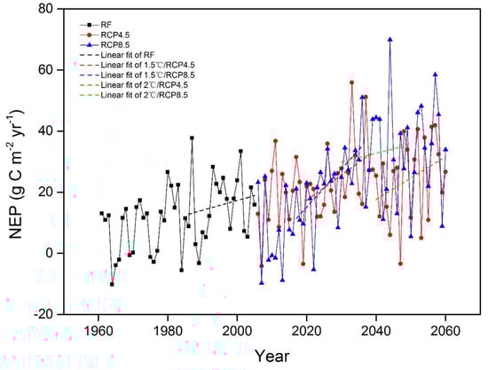 4.2. Additional 0.5 °C Warming Will Depress the Increase Rate of NPP and Carbon Uptake Capacity under the RCP4.5 Scenario