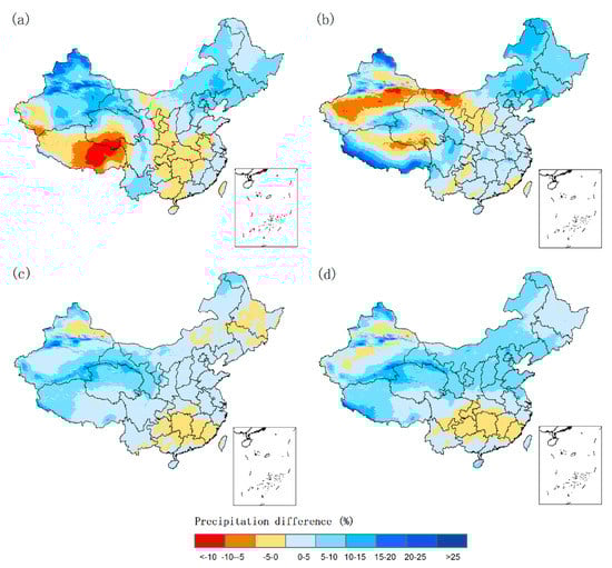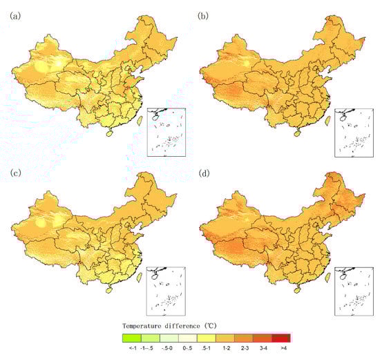 - Zhou, B.; Qin, D.; Wen, Q.; Xu, Y.; Song, L.; Zhang, X. Projected Changes in Temperature and Precipitation Extremes in China by the CMIP5 Multi-model Ensembles. J. Clim. 2014, 27, 6591–6611. [Google Scholar] [CrossRef]