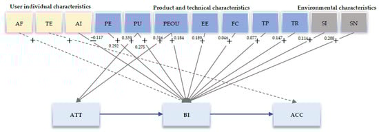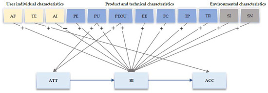 Note: AF—affordability; TE—technology experience; AI—anxiety; PE—performance expectancy; PU—perceived usefulness; PEOU—perceived ease of use; EE—effort expectancy; FC—facilitating conditions; TP—technical performance; TR—trust; SI—social influence; SN—subjective norm; ATT—attitude; BI—behavioral intention; ACC—acceptance.