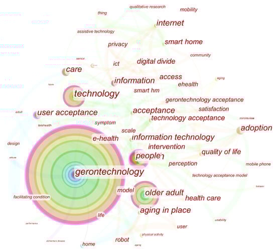 In the CiteSpace keyword co-occurrence map, the frequency reflects the number of citations of hot words in the literature data; centrality, which is a quantification of the median value of the pivot keywords, measures the importance of the position of the word in the network. Frequency and centrality can reflect the popularity and importance of keywords in the study area in the knowledge graph map [37]. With reference to the frequency of citations of hot vocabulary and its centrality, the topic search term “gerontechnology” was expanded to obtain a search vocabulary (Table 1).