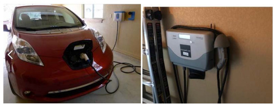 Electricity generated from solar panels may be used to charge electric vehicles (Figure 5). A low-end electrical vehicle such as a Nissan Leaf 8-year costs are estimated to be $36,537.82 with total 8-year energy costs (kWh) at $3969 [64]. When powered by solar that is 100% capable of producing both home and automobile power, there are negligible O&M energy costs. Thus, the difference in cost between an equal value gasoline car (after accounting for any tax credits and residual) would be the maintenance and energy costs. In the simulation, the user selects the car acquisition cost for comparison (possibly zero to omit this element). Equation (15) reflects the implementation of the comparison in the simulation if a user selects an electric vehicle. The last portion of the equation uses the complement of the indicator for electric vehicles (EVs) and multiplies that by the annual cost of driving. The user selects the starting gasoline cost (inflated), miles driven, and miles per gallon.