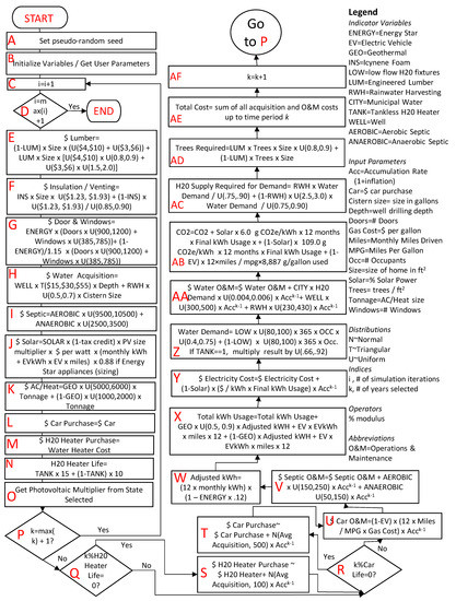 Next, acquisition costs are assigned. These costs include lumber (step E), insulation/venting (step F), doors and windows (step G), water acquisition (as needed, step H), septic (step I), solar (step J), HVAC system (step K), vehicle acquisition costs (if desired to compare electrical versus non-electrical, step L), and water heater acquisition (step M). Additionally, water heater life (step N) and the state photovoltaic multiplier (step O) are obtained [58]. These elements are included in the left-hand column on the flowchart. At the bottom of this column, iterations for the number of years (user selected up to 40 and indexed as k) begin (step P).