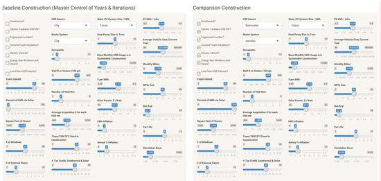 The baseline scenario was set to include the parameters in Figure 8. Runs were based on 30-year ownership, 3000 square feet construction (279 square meters), 25 windows, 3 external doors, 2 occupants, 2 water heaters, $1000 water heater acquisition, 30% tax credit, 5 ton (4.5 metric ton) heat pump/geothermal heat pump in Texas, 1500 base kWh usage per month, $0.13 per kWh utility costs, $3.30 per watt solar panels, 3% annual inflation, 0.3 kWh per mile for EV, $30,000 base cost for vehicles, 1100 monthly miles, 30 mpg for gas vehicles, $2.20 per gallon for gasoline, 8-year car life, and 2000 simulation runs. Comparative construction analysis in Figure 8 included all possible sustainable checkboxes offered in the simulation plus rainwater harvesting and an aerobic septic system, mimicking the research residence.