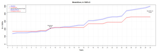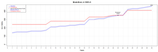 Figure 9 shows the graphical results of the break-even analysis for Scenario 1. The break-even time based on this analysis is about 23 years due to the up-front expenses. At 30 years, the cost savings are estimated to be $50,000. The sustainable construction option saves 60,736 kilograms of CO2 (Equation (14)) and requires 5495 fewer kilogallons of water to meet demand over the 30-year lifespan. The sustainable option requires 201 fewer MWh over the course of 30 years, and the grid cost is zero as solar provides 100% of the power required. While better for the environment, water and wastewater are more expensive for sustainable construction and can never achieve any break-even. An inherent assumption and limitation with this scenario is that a 100% solar option provides sufficient electricity for the household without the additional need for grey electricity. In other words, the home has sufficient storage such that it consumes no power from the grid day or night.