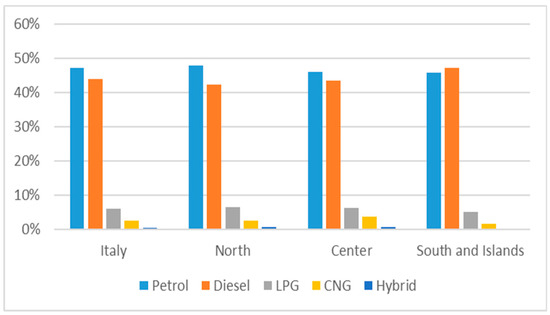 In Figure 1, the percentage classification per type of fuel is reported, comparing the situation in Italy and per macro area (North, Centre, and South). It can be observed how 91% of the Italian car fleet is composed of vehicles powered by petrol (44%) and diesel (47%), with low percentages (9%) of hybrid or bi-fuelled cars.