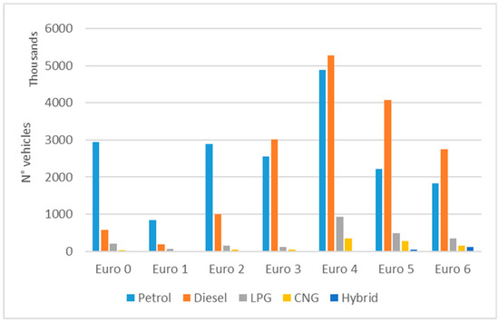 Starting from the Italian database (Automobile Club Italia (ACI)) [32], classification of the vehicle fleet has been made, referring to the year 2017, the most recent year for which complete data have been available. In the analysis, only passenger cars have been considered, excluding light and heavy goods vehicles, buses, and motorcycles. On 31 December 2017, the total number of cars circulating in Italy was 38.520.321. Their classification was obtained combining the type of fuel, the engine power, and the emission class, referring to European Standards.