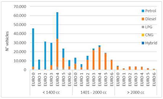 The classification showed that the number of petrol vehicles is high for low engine powers, especially for the Euro 0 class, and only in Euro 4 one the presence of diesel vehicles is relevant. Their number increases as the engine power does, representing the greatest part of the corresponding classes.