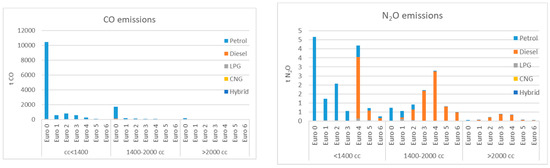 Concerning the emission class, emissions from Euro 0 one are particularly relevant, apart from NH3 and PM2.5, whereas Euro 4 is responsible for high emissions of N2O, PM2.5, and CO2 and Euro 2 of NH3.