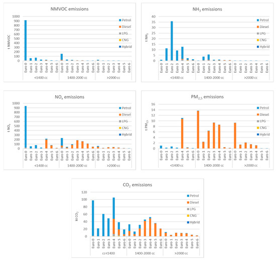 The emissions of the car fleet of Reggio Calabria in 2017, subdivided per emission class and fuel type, obtained using Equations (1) and (2), are reported in Figure 4, whereas Figure 5 shows the percentage contribution of the different fuels to the various pollutant emissions.