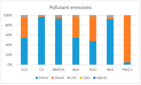 With regard to the fuel, petrol cars seem to be responsible for the major part of CO, NMVOC, and NH3, diesel ones for PM2.5, whereas both fuels contribute half-half to CO2, NOx, and N2O emissions.