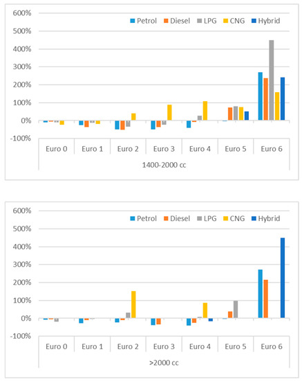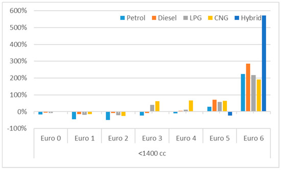 In Figure 6, the vehicle percentage reduction/increase per class is reported: A significant decrease can be observed for the classes Euro 0–Euro 4, mainly for petrol and diesel vehicles, and a marked increase for the classes Euro 5–Euro 6.