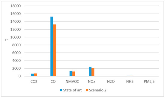 From Table 8, it can be observed that the most significant reductions from the initial state occur for NH3 (28%), CO and NMVOC (17%), and PM2.5 (13%), whereas the other nitrogen compounds suffer a lower reduction (5%). CO2, instead, increases by 4%.