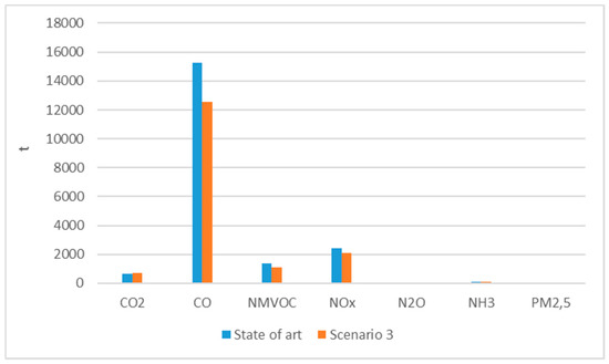 Emission reductions produced by Scenario 3 are reported in Figure 9. This scenario shows major reduction percentages for CO, NMVOC, and PM2.5 (−18%) and lower (9%–13%) for the nitrogen compounds. CO2 increases by 3% (Table 8).
