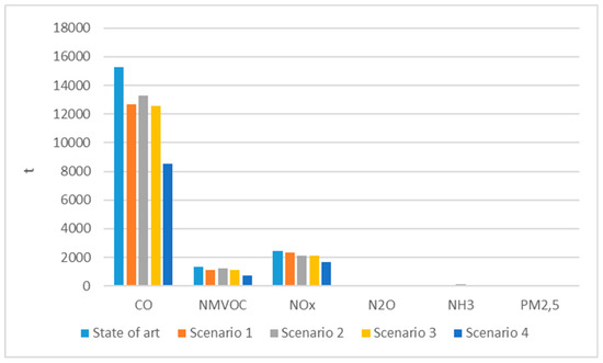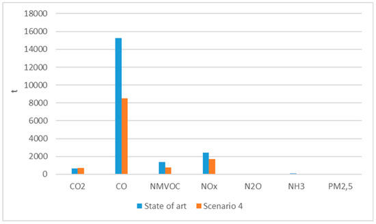 Emission reductions produced by Scenario 4 are reported in Figure 10. The fourth scenario seems the most effective, in particular for CO and NMVOC, for which reductions are 44%–45%, PM2.5 (35%) and NOx (30%). N2O and NH3 decrease is slightly lower (20%–24%) (Table 8). Moreover, even in a drastic scenario like the fourth, an increase of 2% of CO2 occurs.