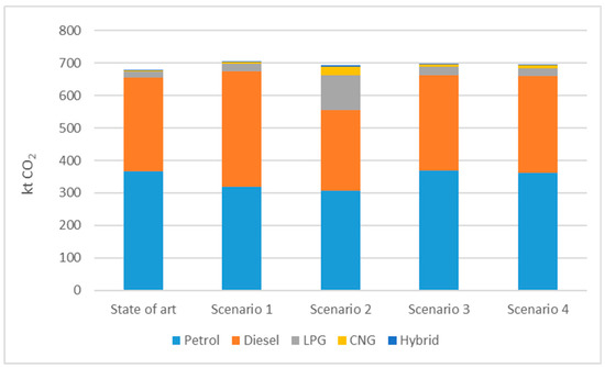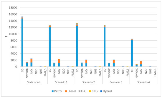 Concerning CO2, from Figure 11, it can be observed that its emissions increase in all scenarios, due to the increase in the total number of vehicles. Moreover, Figure 13 points out that CO2 emissions in all scenarios derive in a rather equal way from both petrol and diesel vehicles, apart from Scenario 2, where a strong impact is also due to LPG vehicles, for their number increases.