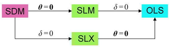 Elhorst et al. [,] have elaborated on the theory of spatial panel models and the following description of the theory are quoted from them. The spatial Durbin model (SDM) and its relationship to other simplified models are shown in Figure 1.
