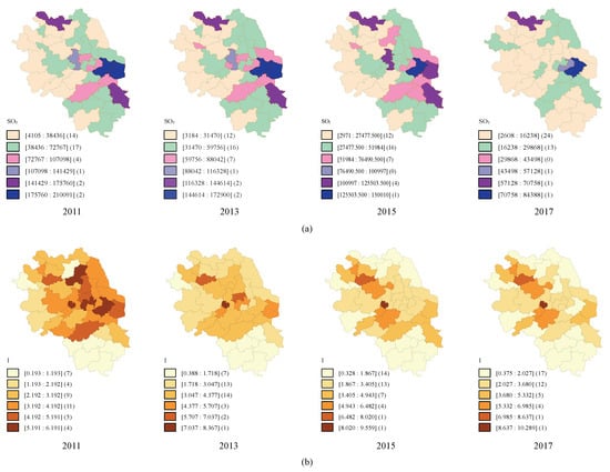 Choropleth maps in Yangtze River Delta from 2011 to 2017. (a) SO emissions, (b) foreign direct investment.